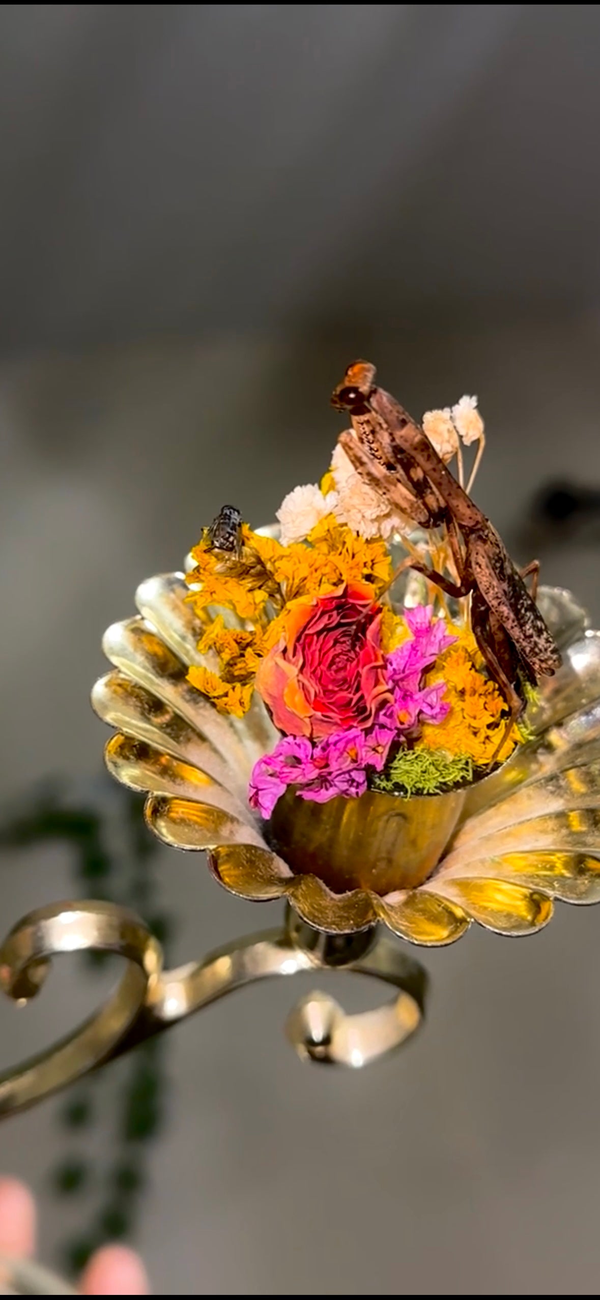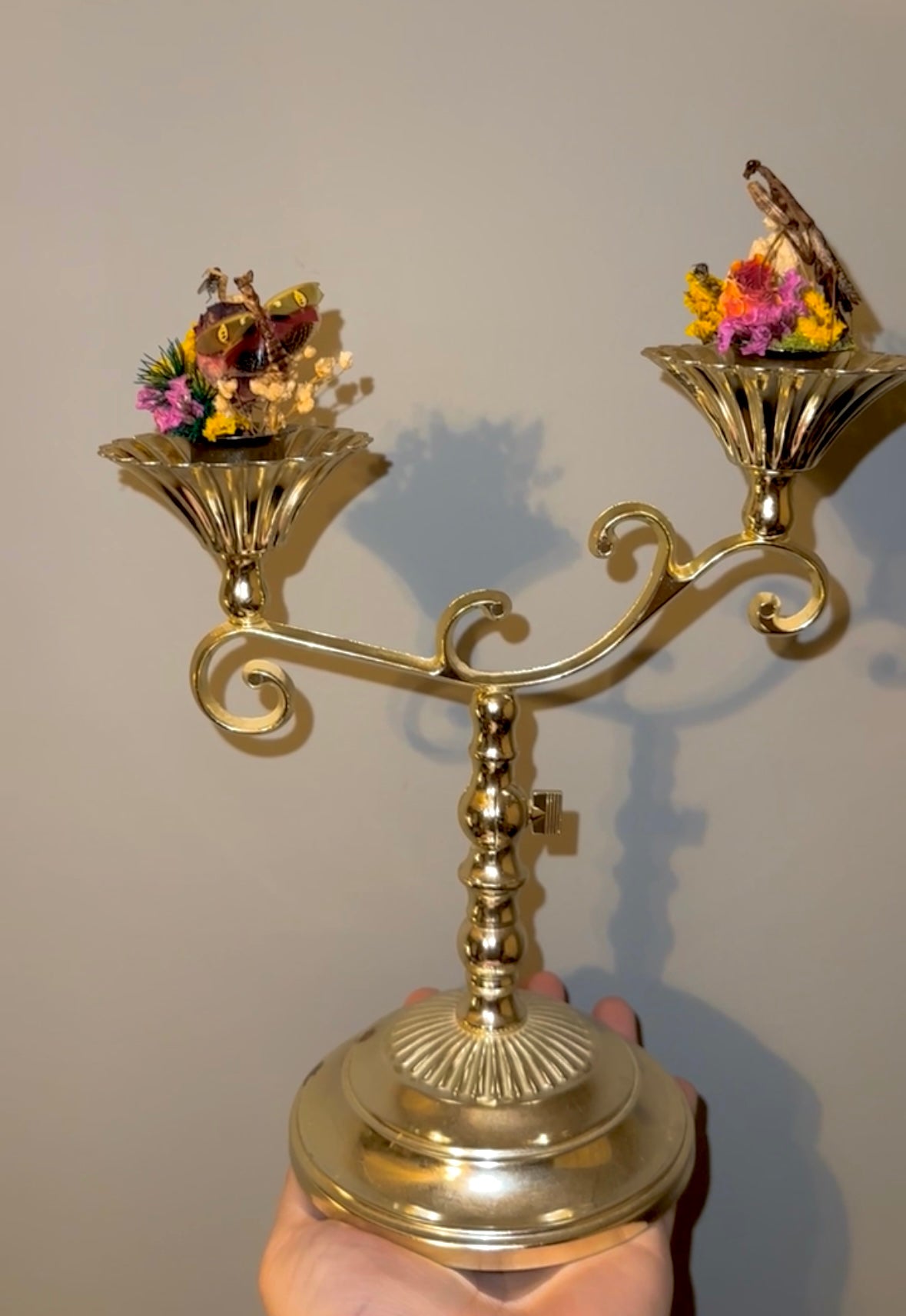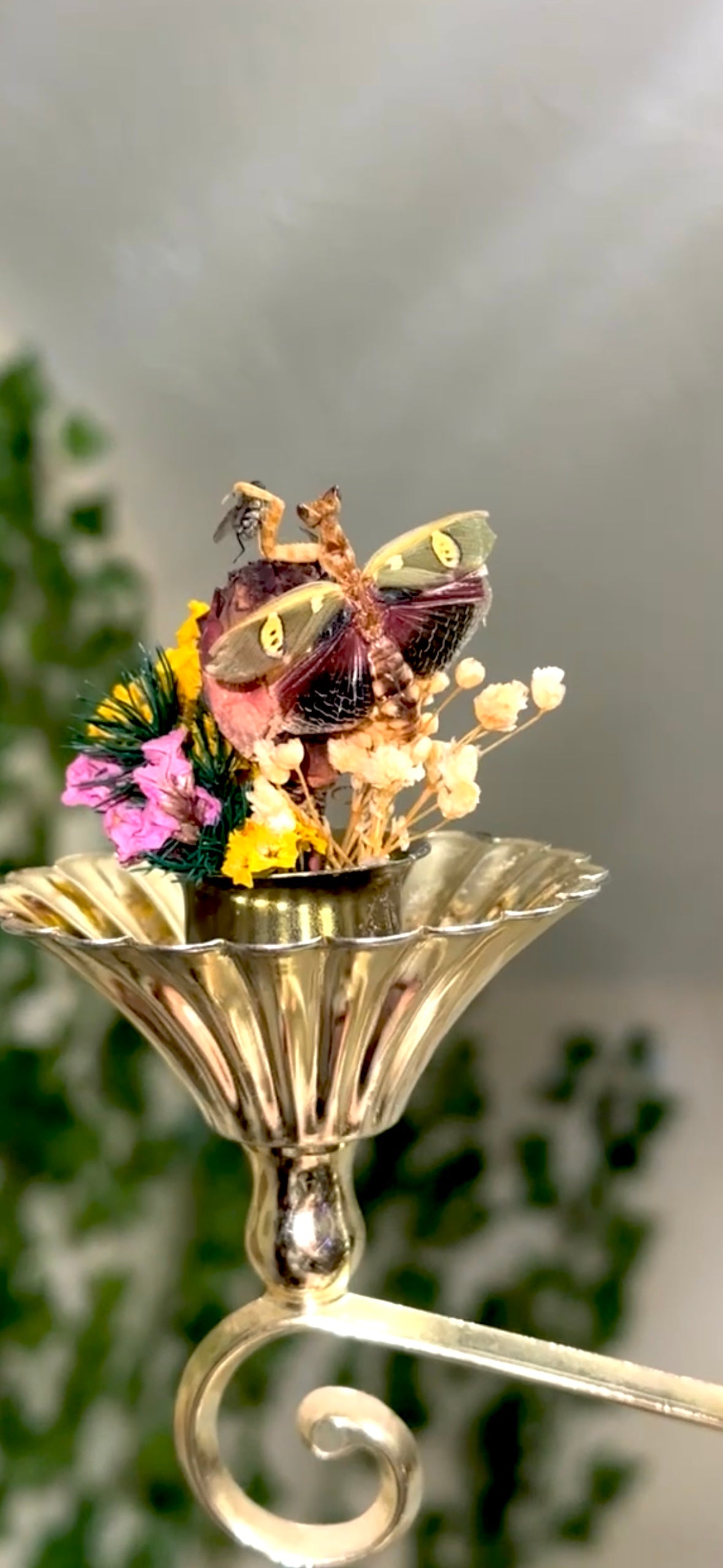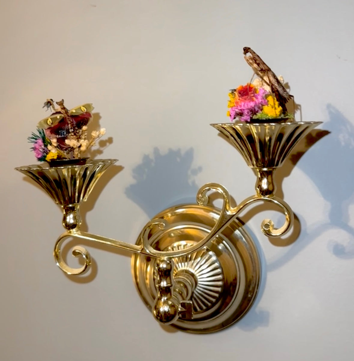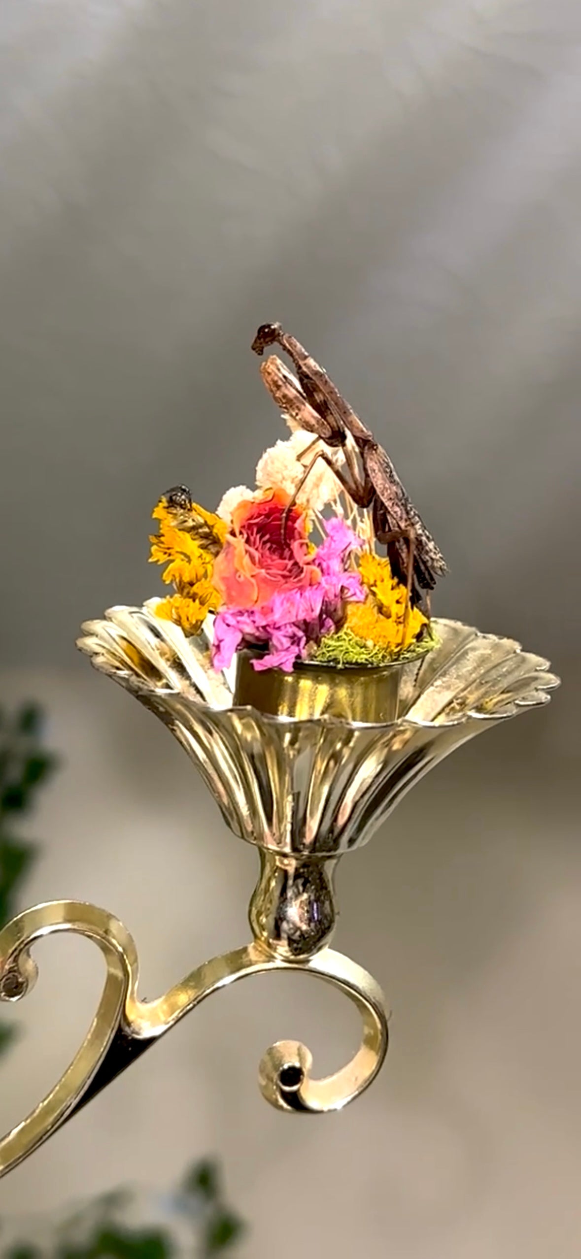 A jeweled flower mantis and a Carolina mantis on A wall sconces/table piece it functions as both