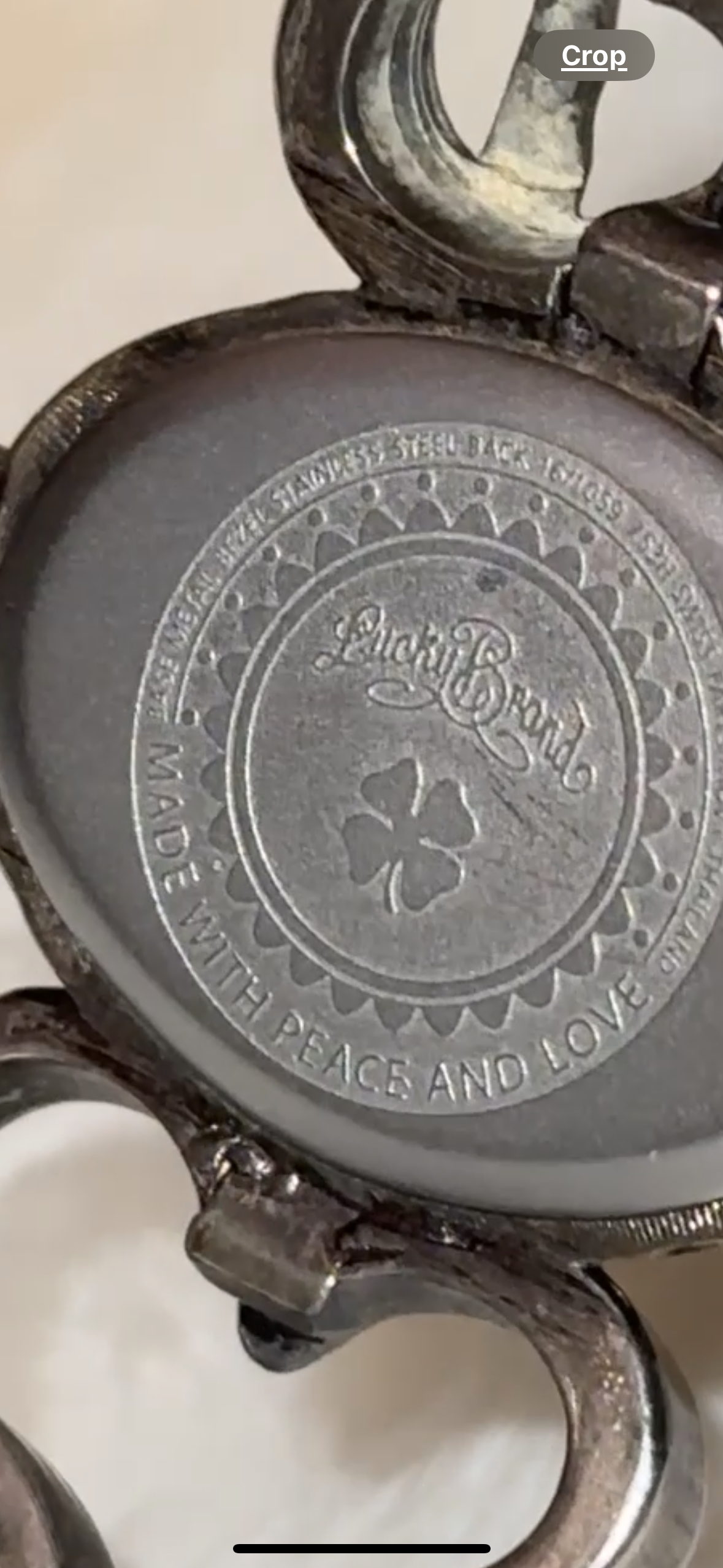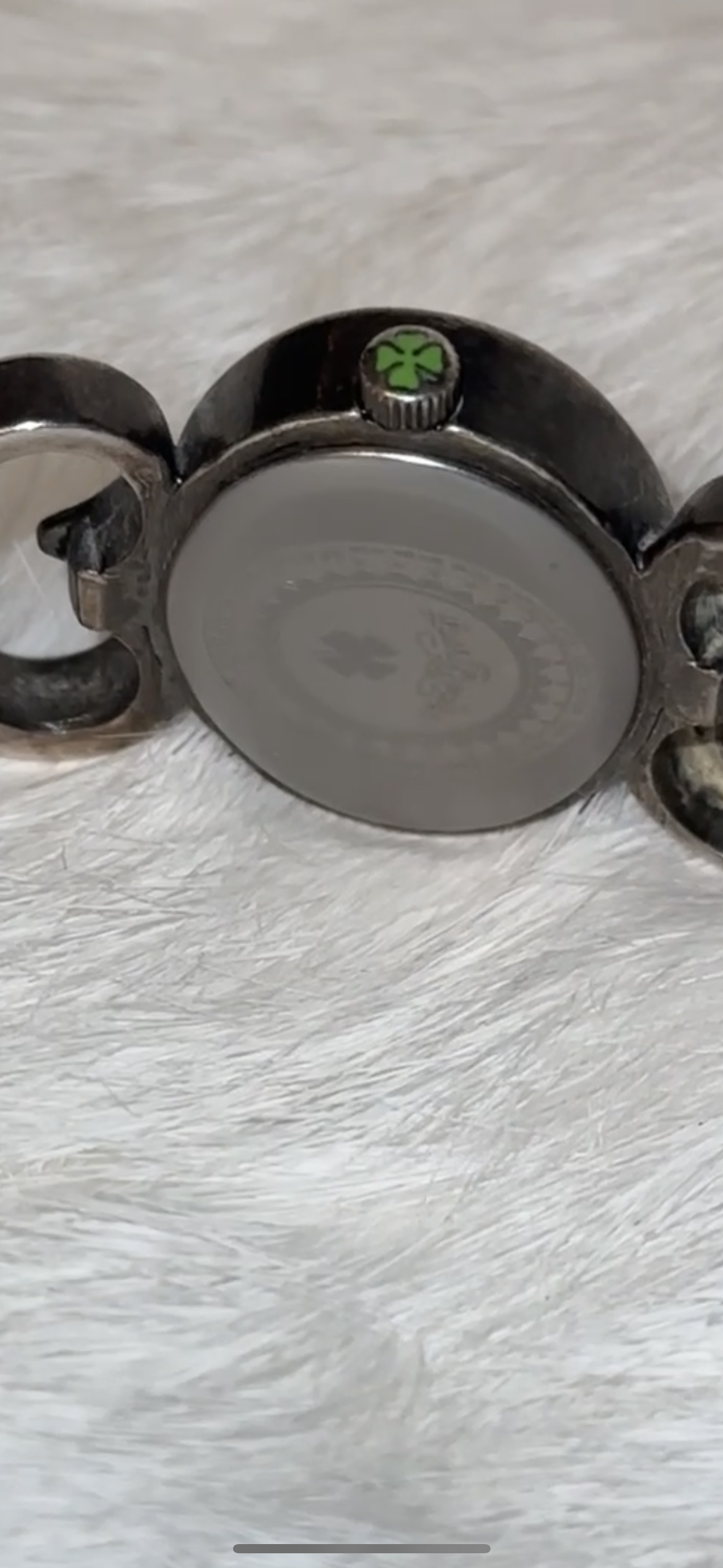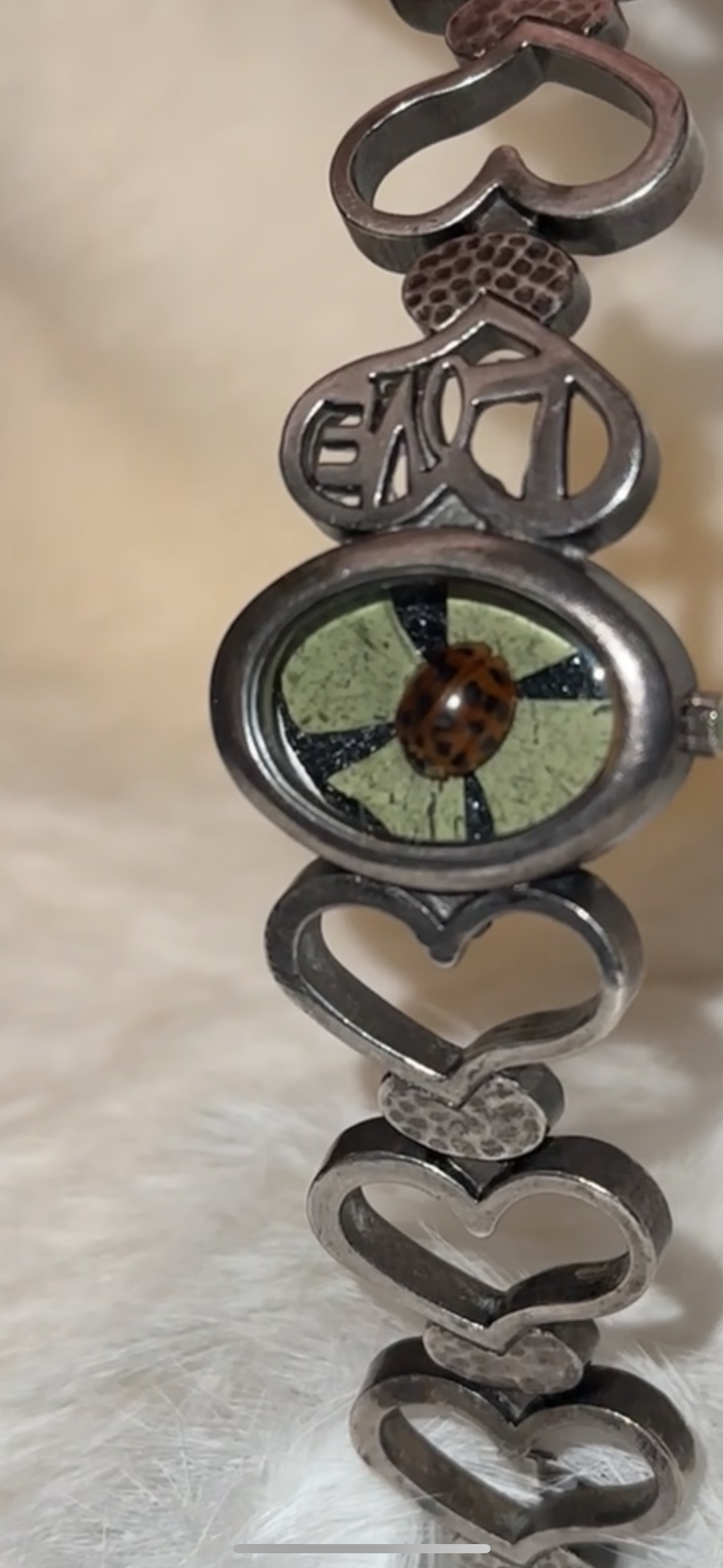 This is a vintage repurposed, lucky brand, silver with a preserved ladybug and four leaf clover
